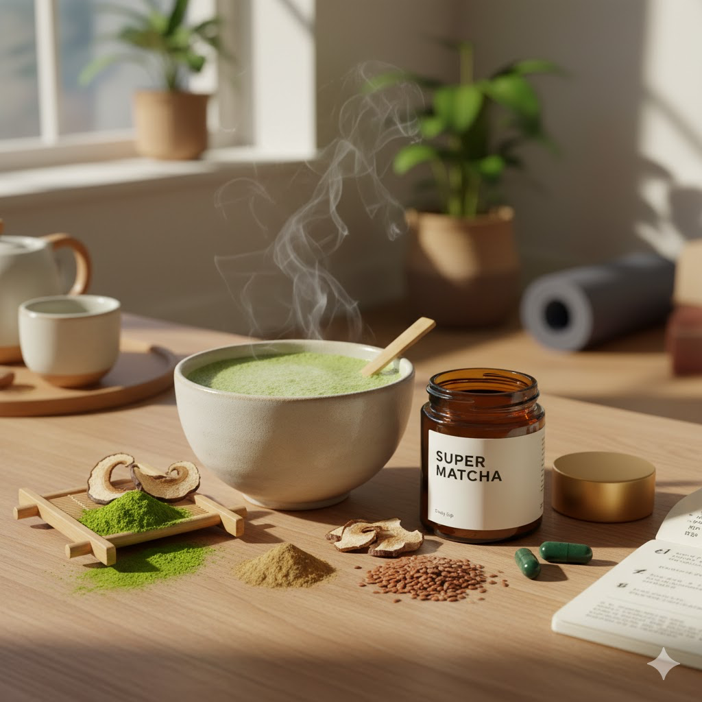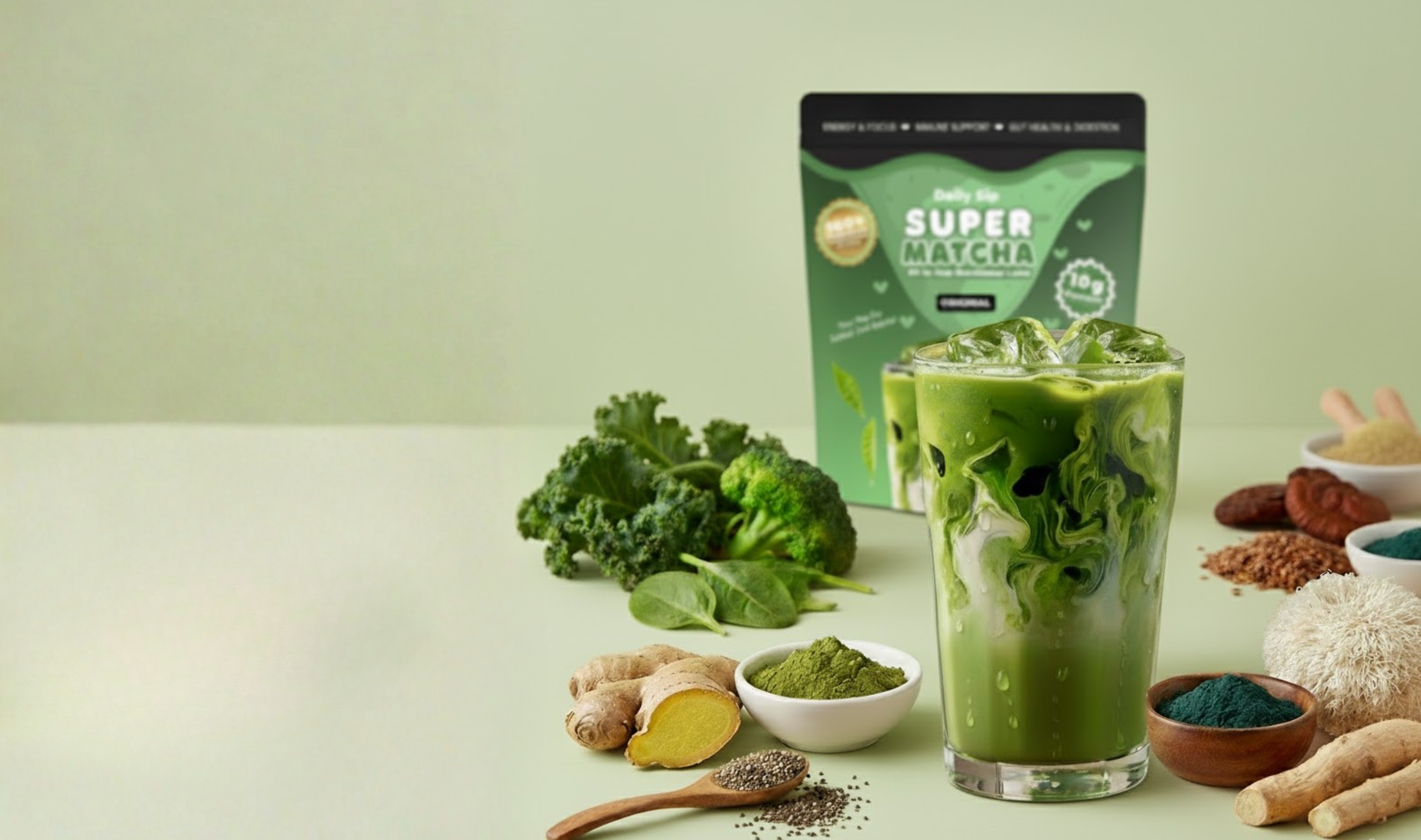 Ingredients include: Ceremonial Matcha, Probiotic Blend (5B CFU), L-Glutamine, Digestive Enzymes, Acacia Gum (Prebiotic Fiber), Ashwagandha, Lion's Mane, Reishi, Cordyceps, Ginger Extract, Spirulina, Chlorella, Superfood Greens Blend, Organic Plant Protein, and Essential Vitamins & Minerals.