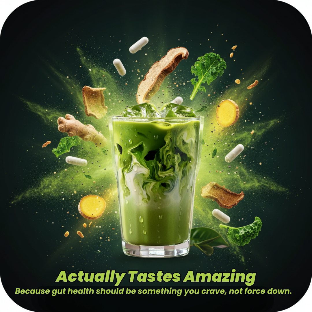 We've carefully designed this blend to deliver complete gut repair, digestive comfort, and stress relief in the cleanest way possible. Each serving combines ceremonial matcha to reduce inflammation and create an optimal healing environment, 5B CFU probiotics + 8 prebiotic sources to restore and feed beneficial gut bacteria, L-Glutamine to repair damaged gut lining, and Ashwagandha + Lion's Mane to calm stress-induced bloating through your gut-brain axis. To round it out, we've included digestive enzymes, ginger for soothing relief, and superfood greens to support detox and complete nutrition. The result is a formula that provides immediate digestive comfort, long-term gut healing, and stress resilience without pills, restrictive diets, or side effects. Just clean, science-backed gut health you can trust.